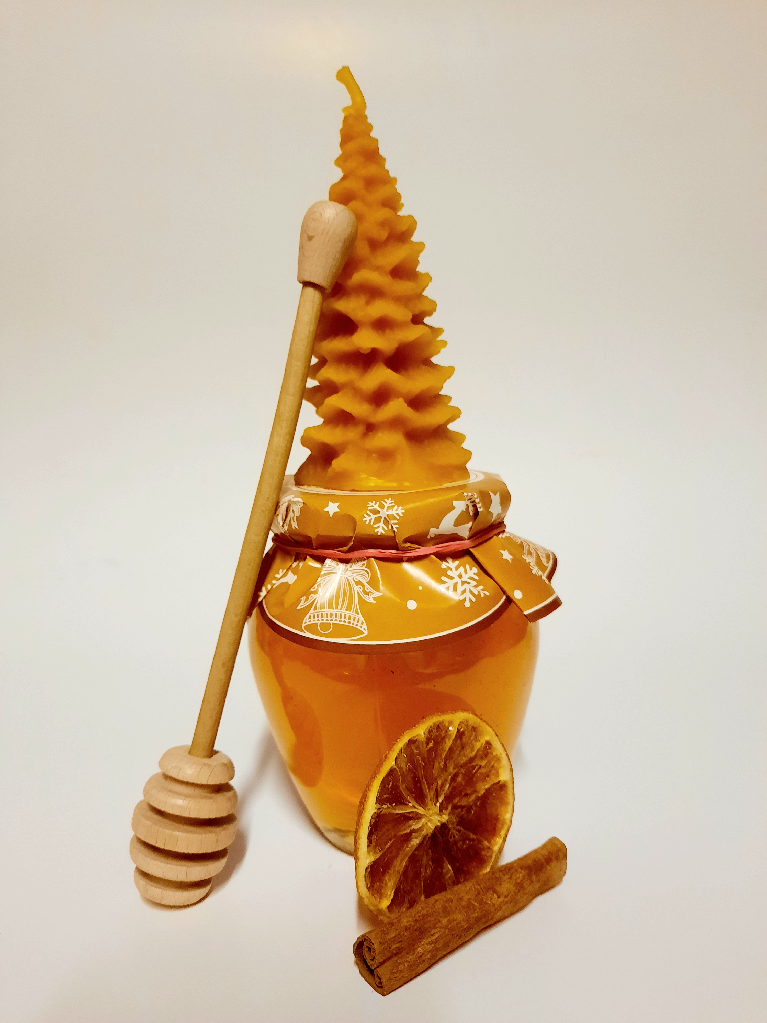Balenie obsahuje kvetový med 470g v amfore, drevenú medulku, voskovú sviečku stromček a dekorácie - sušený pomaranč, škoricu, badián alebo drevenú snehovú vločku