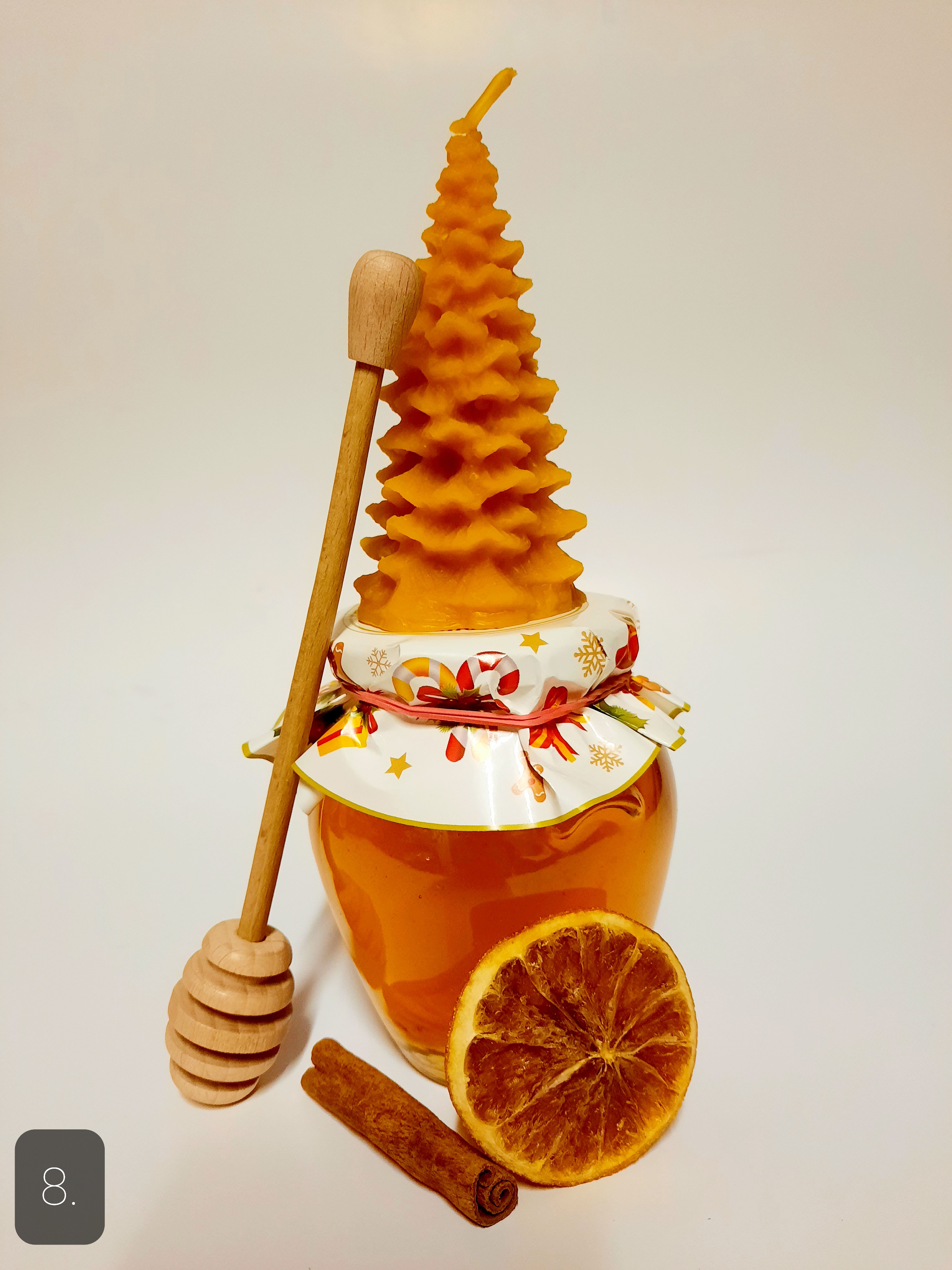 Balenie obsahuje kvetový med 470g v amfore, drevenú medulku, voskovú sviečku stromček a dekorácie - sušený pomaranč, škoricu, badián alebo drevenú snehovú vločku