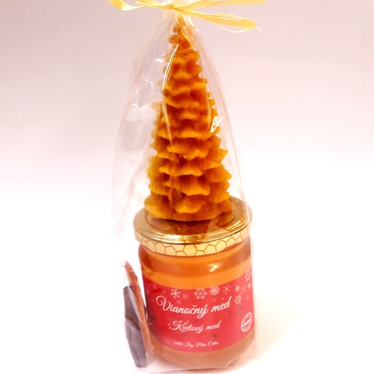 Balenie obsahuje kvetový med 250g, voskovú sviečku stromček a dekorácie - sušený pomaranč, škoricu, badián alebo drevenú snehovú vločku