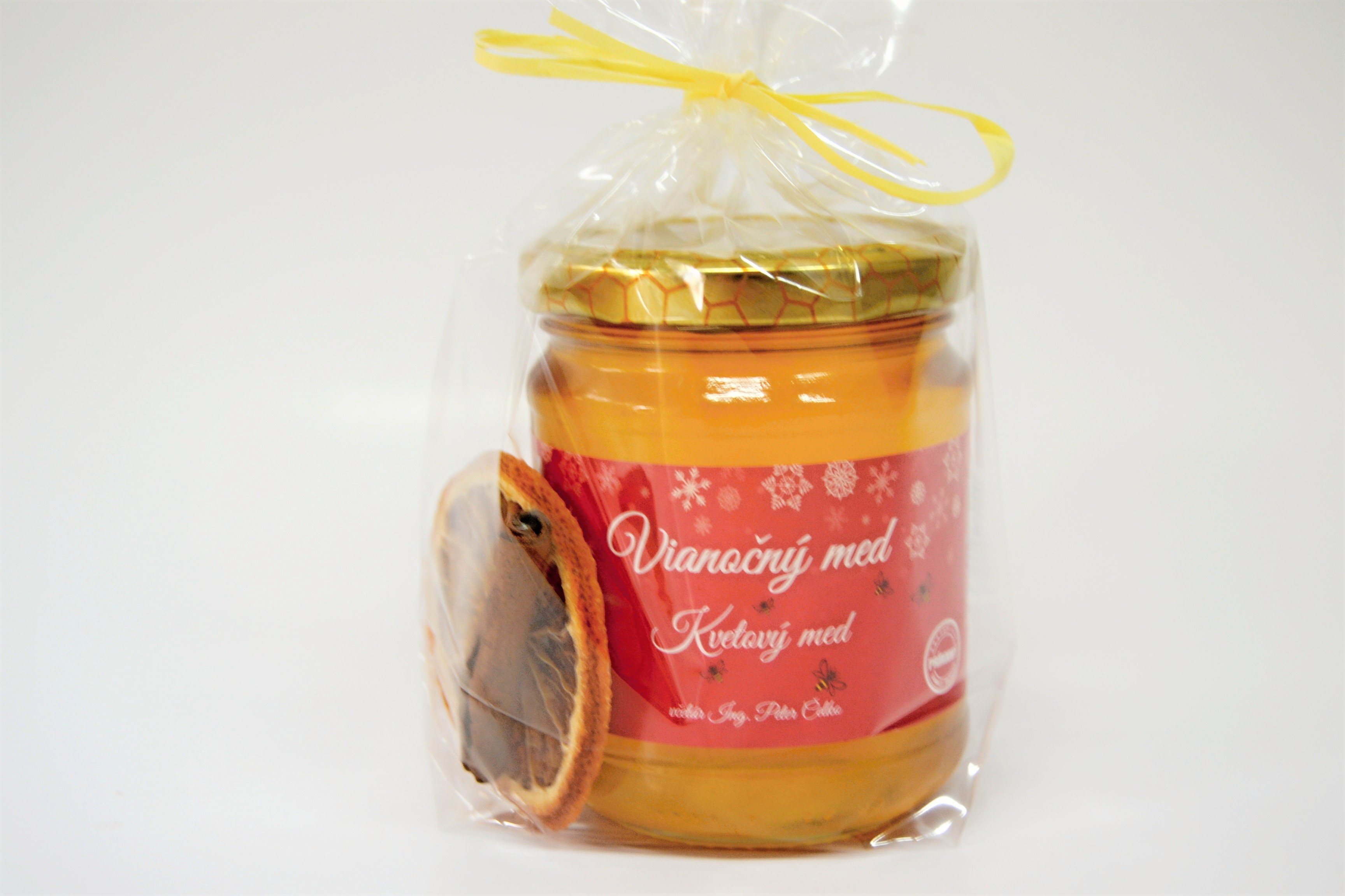Balenie obsahuje kvetový med 250g a dekorácie - sušený pomaranč, škoricu, badián alebo drevenú snehovú vločku